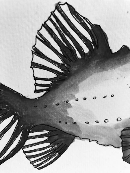 Dans le Saint-Laurent, il y a des poissons qui sont vraiment plus flamboyants que d’autres. La poule de mer de l’Atlantique en fait partie. D’un rouge vif,elle change de couleur avec les saisons. La première fois que je l’ai observée en plongée sous-marine, j’ai tout de suite remarqué la beauté de ses nageoires. On a l’impression de voir un éventail de voiles de soie transparente. Il a aussi un autre élément cocasse : sa quasi-nageoire dorsale. On a l’impression qu’il y a quelque chose qui n’est pas fini. C’est son petit côté comique ; sujet parfait pour la création d’un motif. Après plusieurs heures à dessiner, voici le résultat. Vous trouverez que plusieurs de nos produits arborent ce motif distinctif. |